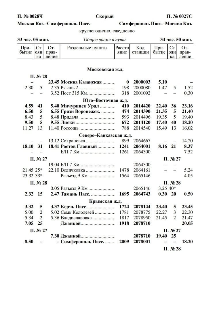 Двухэтажный скорый поезд под № 28 будет отправляться из Москвы в 23:44 часов, а прибывать в Симферополь в 8:50 часов через сутки. Общее время в пути около 34 часов.