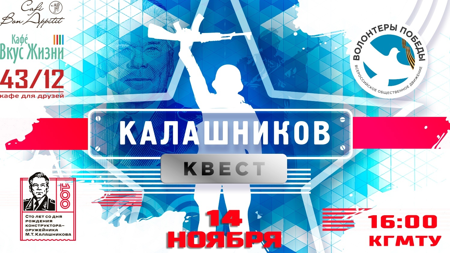 Квест посвящен 100-летию со дня рождения русского изобретателя Михаила Калашникова. Участников ждут задания на логику, знания историю и на командообразование.
