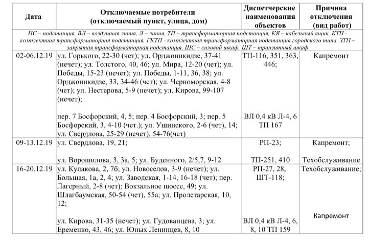 В связи с плановым ремонтом электрооборудования в декабре в период с 8 до 17 часов будут происходить отключения линий электропередачи согласно нижеприведенному графику. Об этом сообщает ГУП РК «Крымэнерго», - передает Керчь.ФМ.