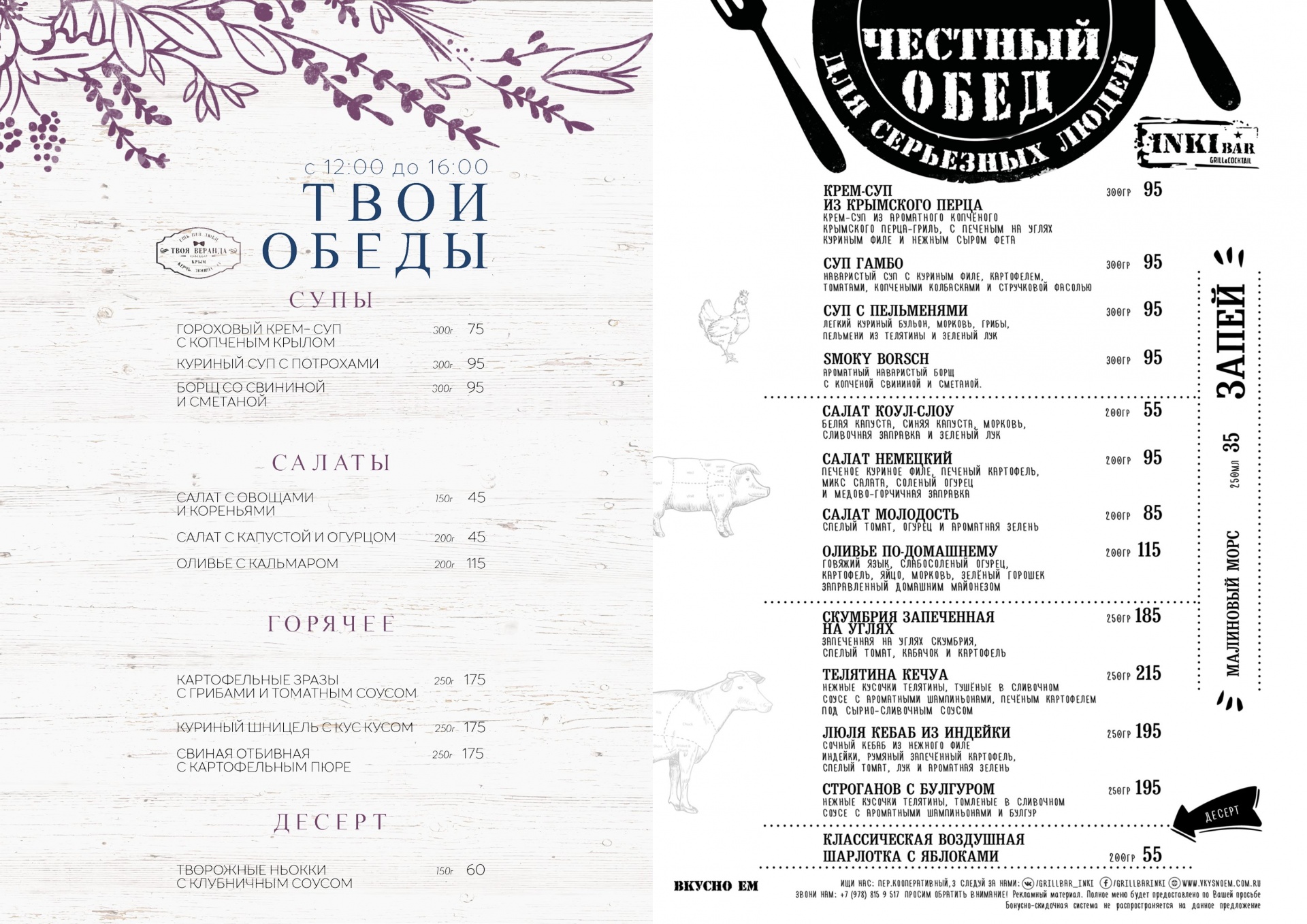 Супы: борщ со свининой, гороховый крем-суп с копчёным крылом, куриный суп с потрохами,
