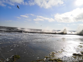 Волны доходят до подпорной стенки, а местами и дальше. Рядом с памятником десантникам сгнил и упал металлический столб. К нему ведут электрические провода.