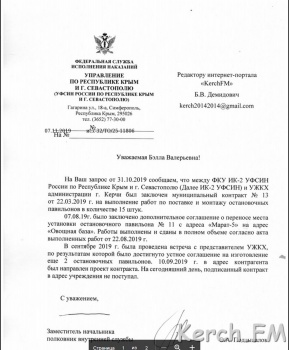 В сентябре 2019 г. Была проведена встреча с представителем УЖКХ, по результатам которой было достигнуто соглашение на изготовление еще 2 остановочных павильонов. 10.09.2019 г. В адрес контрагента был направлен проект контракта. На сегодняшний день, подписанный контракт в адрес учреждения не поступал», - пописал своей ответ замначальника учреждения полковник внутренней службы О.А. Подзывалов.
