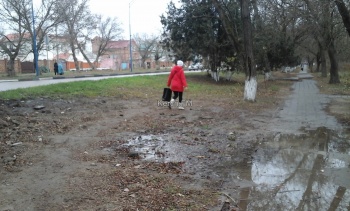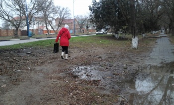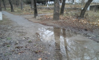 Питьевая вода обильно залила пешеходный тротуар и людям приходиться обходить лужу по вскопанной земле либо по автомобильной дороге.