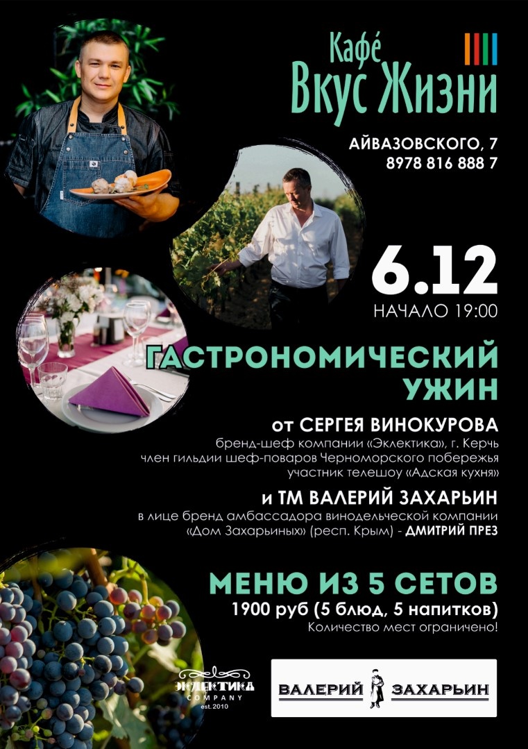 Какие планы на пятницу? 6-го декабря кафе "Вкус Жизни" приглашает гостей на очередной гастрономический ужин от бренд-шефа компании "Эклектика", Сергея Винокурова, и винодельческой компании "Дом Захарьиных". Специальный гость вечера - представитель ТМ Валерий Захарьин, бренд-амбассадор винодельческой компании "Дом Захарьиных", Дмитрий През.