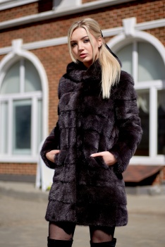 «Кировчанка-2» также слегка расширена в зоне талии, что легко регулируется широким атласным поясом. Меховые заготовки располагаются либо прямо преимущественно по всей площади спинки и полочек и поперечно по низу изделия, либо полностью поперечно. Капюшон оторочен мехом черно-бурой лисицы, что идеально сочетается с расцветкой модели (черный, блек вельвет и графит).