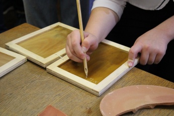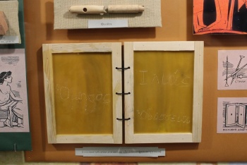 В зале посетителей ожидал небольшой мастер-класс — на столе были разложены восковые таблички, фрагменты керамики, тушь и стили, для написания. Все желающие смогли почувствовать себя настоящим жителем Боспорского царства и понять как это — писать стилем на восковой табличке или тушью на керамике.