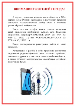 В случае ухудшения качества связи абоненту с SIM-картой «МТС Россия» необходимо в настройках телефона отключить «Автоматический выбор сети» и включить режим «Ручной выбор сети». Об этом сообщает пресс-служба администрации Керчи, - передает Керчь.ФМ.