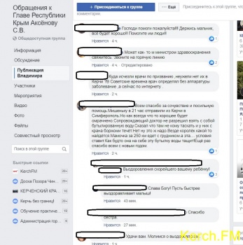 «Здравствуйте, обращаюсь к Вам 02.01.2020г из Керчи. Мой... Л…. М… Ни… 5 месяцев отроду, . 30 декабря ночью ребёнок потерял сознание. Скорая доставила в детскую Керчи. Через два часа приступы повторились и он был переведён в реанимацию ТМО 1Керчи. Приступ купировали и опять перевели в детскую. Потом опять приступ-опять в первую. Приступы продолжаются но теперь и судороги . Анализы хорошие, причину приступов не знаем потому что не на чем произвести обследование энцефалограмму и томографию. Это оборудование для выяснения причины есть на Титова в Симферополе. Но мы не можем добиться отправки в Симферополь. В связи с потерей сознания страдает мозг ребёнка. Если бы мы жили в Симферополе то нас бы сразу доставили на Титова и там бы провели диагностику. Наши врачи говорят что приступы купированы, состояние стабилизировалось. Но приступы повторяются, а нас не отправляют, ждут окончания праздников, наверное .Нам говорят, что состояние стабилизировали но это не так .Только что в 14.00 был очередной приступ. Примите пожалуйста возможные меры . Нашему ребёнку нужна диагностика и лечение которое не могут нам предоставить в Керчи. На не надо на Майями -отвезите ребёнка в Симферополь в областную», - обратились родители малыша через фейсбук на страницу «Обращения к Главе Республики Крым Аксёнову С.В.».