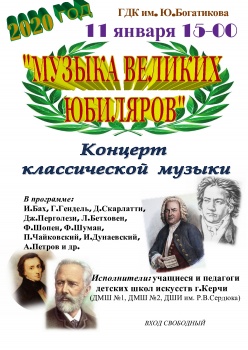В  Городском культурном центре им. Ю.Богатикова 11 января в 15-00 состоится концерт классической музыки, который подготовили педагоги и учащиеся детских школ искусств города Керчи — Детской музыкальной школы №1, Детской музыкальной школы №2 и Детской школы искусств им. Р.В.Сердюка. Об этом  Керчь.ФМ сообщили организаторы.