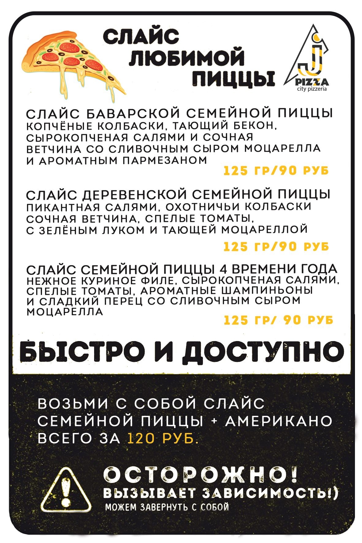 А для тех, кто любит выжать максимум из своего времени и хочет быстро зарядиться энергией на полную, городские пиццерии «J-Pizza» рекомендует насладиться своим перерывом вместе с огромным слайсом килограммовой пиццы и горячим кофе - 120 руб.