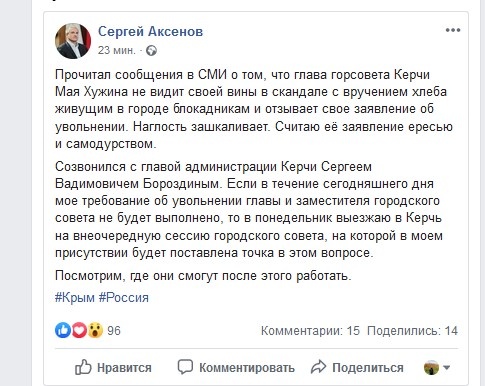 «Прочитал сообщения в СМИ о том, что глава горсовета Керчи Мая Хужина не видит своей вины в скандале с вручением хлеба живущим в городе блокадникам и отзывает свое заявление об увольнении. Наглость зашкаливает. Считаю её заявление ересью и самодурством.