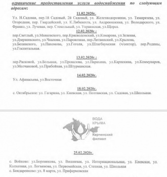 Керченский водоканал сообщает, что оплата за воду должна осуществляться ежемесячно до 10 числа месяца, следующего за истекшим периодом. Из-за нарушения сроков оплаты, с 11 по 29 февраля абонентам, имеющим задолженность более двух расчетных периодов запланировано отключения водоснабжения и водоотведения, - передает Керчь.ФМ.