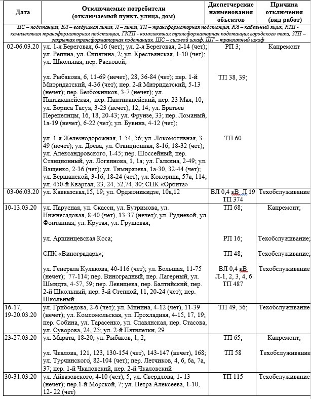 В связи с плановым ремонтом электрооборудования в марте в период с 8 до 17 часов будут происходить отключения линий электропередачи согласно нижеприведенному графику. Об этом сообщает ГУП РК «Крымэнерго», - передает Керчь.ФМ.