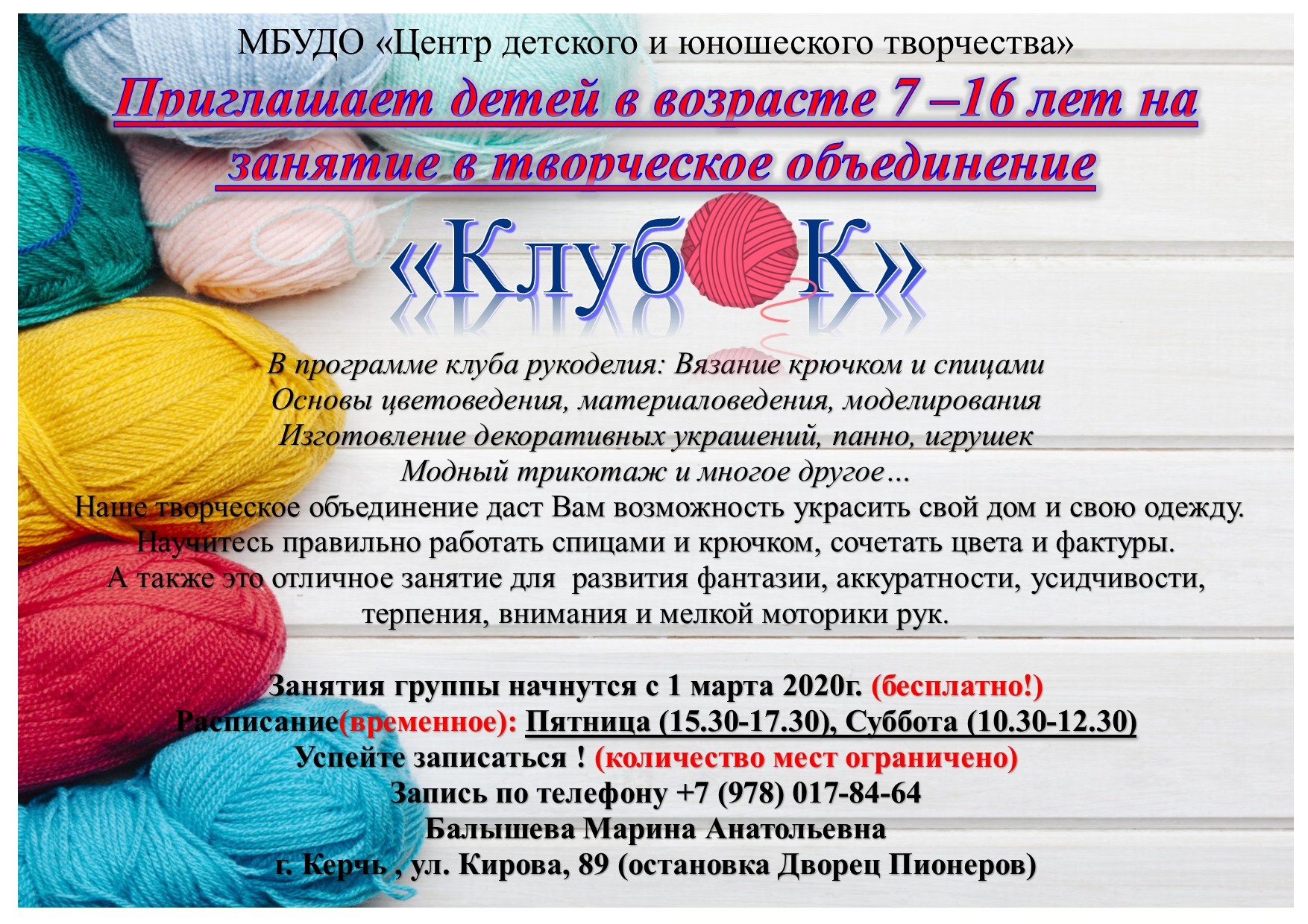 В Центре детского и юношеского творчества (Дворец пионеров) появилось новое творческое объединение «КлубОК». Об этом  Керчь.ФМ сообщили организаторы. Юных керчан приглашают на бесплатные занятия.