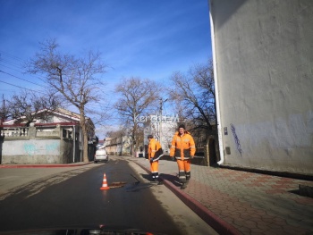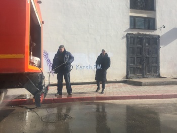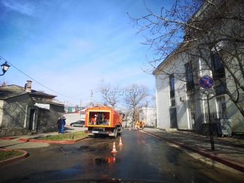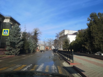 В Керчи 26 февраля на улице Театральной коммунальщики устраняли последствия порыва. С помощью спецтехники они мыли дорогу и тротуар, - передает Керчь.ФМ.