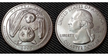 51-ый юбилейный квотер 25 центов США 2020 года посвящен Национальному парку Американского Самоа, 51-й парк. На монете изображена самоанская фруктовая летучая мышь, которая висит на дереве со своим детенышем.