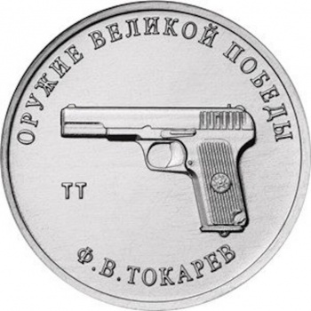 — монета «Конструктор оружия Ф.В. Токарев» расположено рельефное изображение пистолета ТТ, слева — надпись: «ТТ»; по окружности имеются надписи, вверху: «ОРУЖИЕ ВЕЛИКОЙ ПОБЕДЫ», внизу: «Ф.В. ТОКАРЕВ».