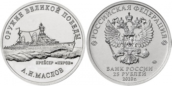 — монета «Конструктор оружия А.И. Маслов» расположено рельефное изображение легкого крейсера проекта 26 «Киров», под ним — надпись: «КРЕЙСЕР «КИРОВ»; по окружности имеются надписи, вверху: «ОРУЖИЕ ВЕЛИКОЙ ПОБЕДЫ», внизу: «А.И. МАСЛОВ»;