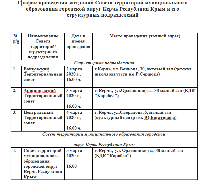 Совет территорий муниципального образования городской округ Керчь Республики Крым - 5 марта 2020 г. 16.00 г. Керчь, ул. Орджоникидзе, 88 малый зал (КДК "Корабел").