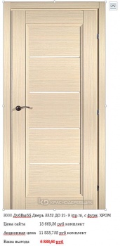 ТД ВЕЛЕС, совместно с фабрикой Краснодеревщик (Челябинск) ,  проводит Акцию на витринные полотна - данная акция связана с заменой на новые витринные полотна, т.е. можно приобрести акционное полотно с витрины при этом сэкономив, и дозаказать такую же модель с фабрики в любом  необходимом количестве. Фабрика Краснодеревщик является одной из лучших в России по производству межкомнатных дверей, все модели данной фабрики универсальные, двухсторонняя фрезеровка отверстий под фурнитуру. Регулирование открывания за счёт перемещения замка и установки ввертных петель в подготовленные в заводских условиях отверстия, закрытые декоративными заглушками. Дверной погонаж зарезан, что значительно упрощает установку. Итальянская пленка CPL сверхпрочна и устойчива к влаге.  Так же большой модельный ряд шпонированных полотен и Эмаль по МДФ.