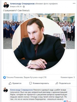 В то же время, на своей личной страннике в соцсети Спиридонов уточнил, что неприятный разговор с керченской администрацией был связан с торможением приватизации керчанами своих квартир.
