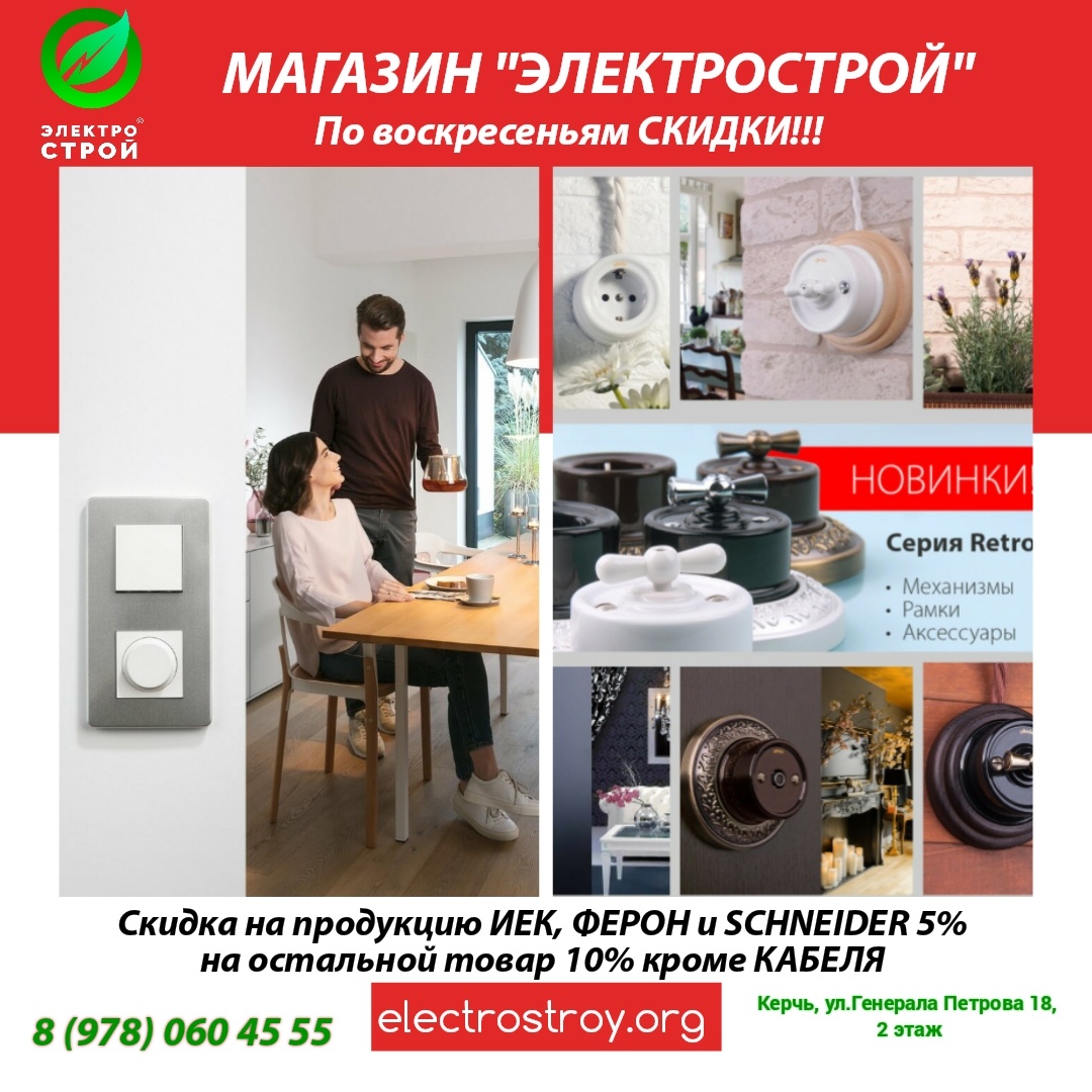 Каждое Воскресенье скидка на люстры, светильники, электротовары в магазине «Электрострой»!