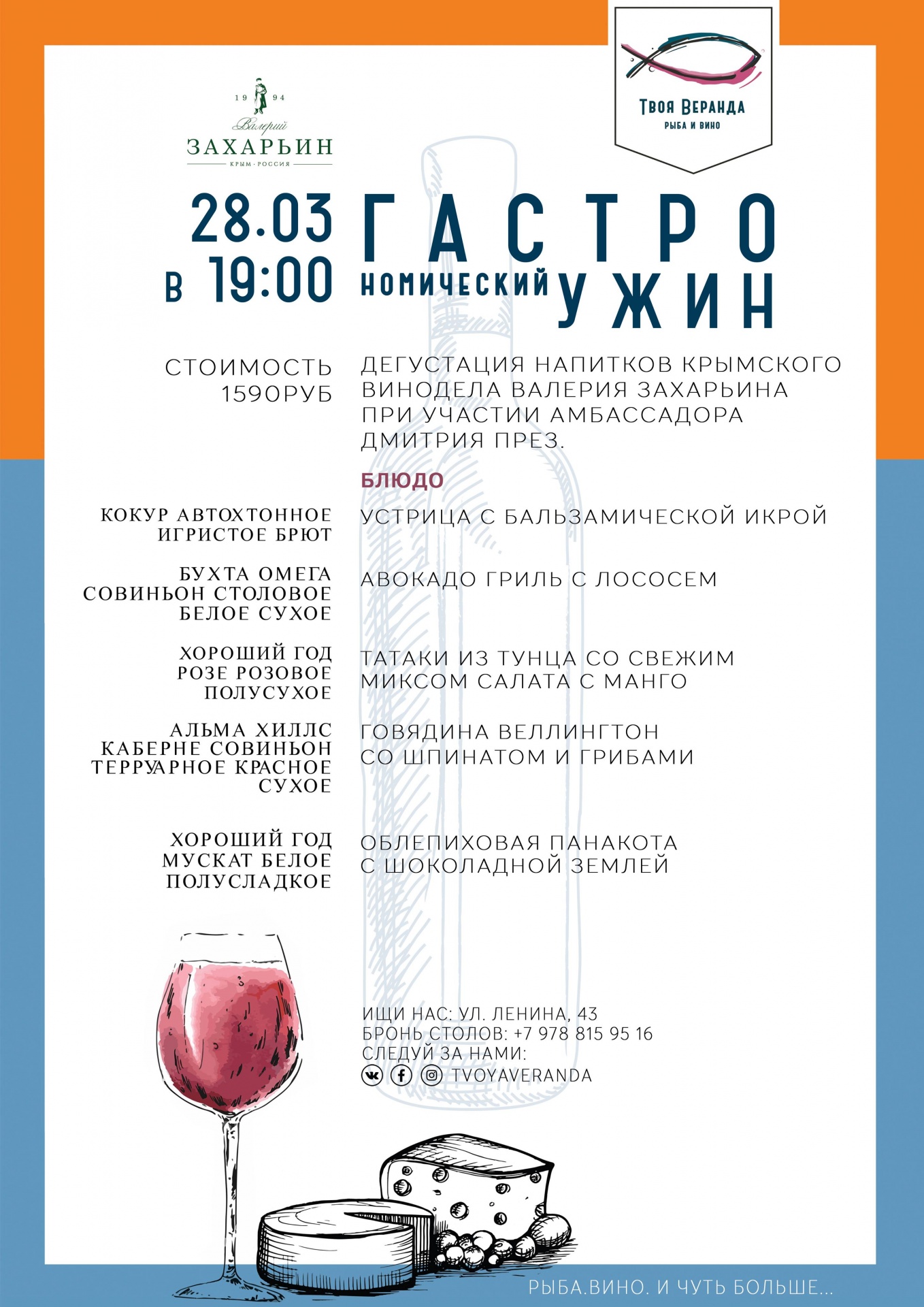 28 марта мы проведём вечер в компании бренд-амбассадора Дмитрия През, который расскажет, в чём заключается уникальность крымских виноградников Валерия Захарьина, какое количество сортов винограда насчитывает его частная коллекция, а также мы откроем культуру потребления данных напитков с новой стороны. Специальные блюда от Шефа раскроют уникальные нотки крымского автохтонного винограда и станут гармоничным сопровождением нашего вечера: