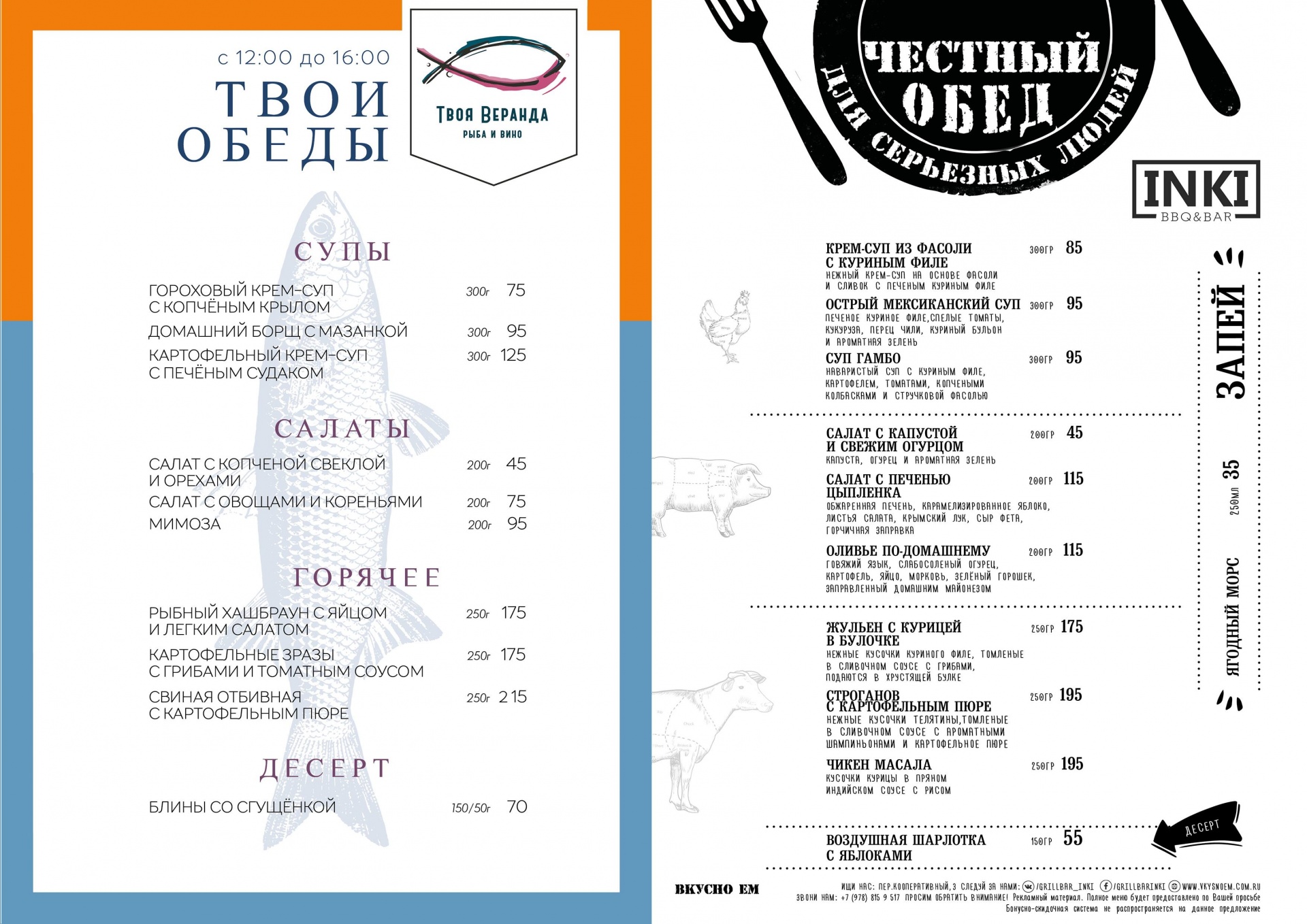 Твоя Веранда. Рыба и вино, INKI. BBQ&BAR, городские пиццерии J-Pizza каждую неделю с понедельника по пятницу с 12:00 до 16:00 готовят для Тебя сытные обеды по честным ценам!