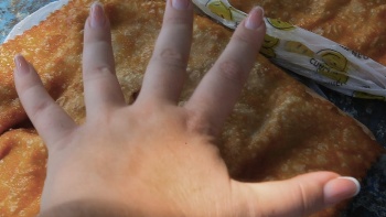 На центральном рынке торгуют чебуреками и шаурмой, рядом стоят столы, люди стоят и едят.