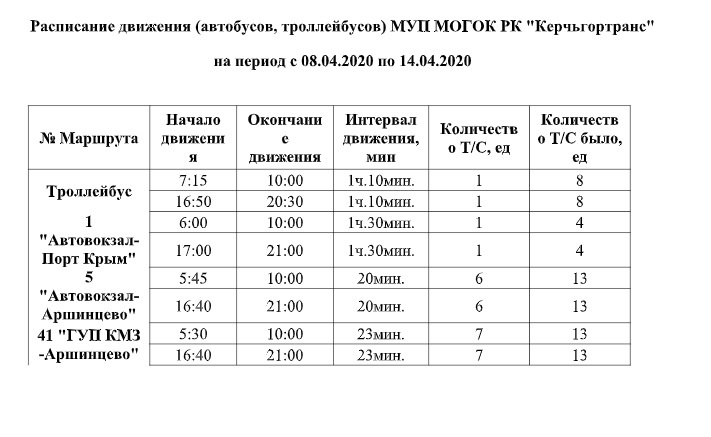 Администрации Керчи сообщает обновленное расписание движения автобусов, троллейбусов МУП МОГОК РК «Керчьгортранс» на период с 08.04.2020 по 14.04.2020, - передает Керчь.ФМ.