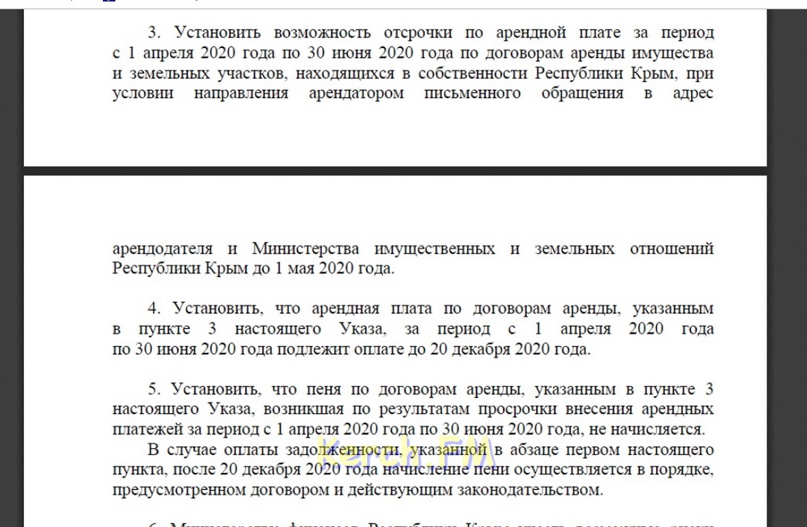 Так, согласно Указу главы Крыма от 25 марта 2020 года № 75-У «О первоочередных мерах поддержки субъектов малого и среднего предпринимательства Республики Крым в связи с осуществлением мер по противодействию распространению на территории Республики Крым новой коронавирусной инфекции 2019-nCoV», предоставлять отсрочку по оплате за аренду госимущества РК с 1 апреля по 30 июня 2020 года, которую можно будет оплатить до 20 декабря текущего года. Относительно же аренды муниципального имущества, то Указом даны рекомендации принять аналогичные меры.
