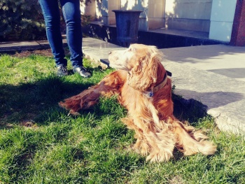 Нашлась собака, ухоженный чистый спаниель, с ошейником, очевидцы говорят, что сбежал из маршрутки. Сейчас находится по адресу: ул. Кирова, 5.