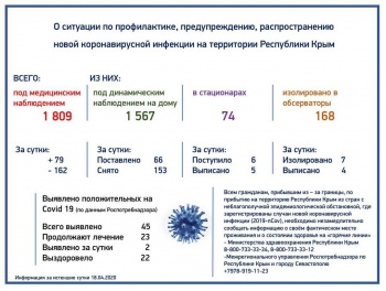 По данным ежедневного мониторинга по сложившейся ситуации с новой коронавирусной инфекцией в Республике Крым, под медицинским наблюдением находятся 1809 человек. Из них под динамическим наблюдением на дому находится 1567 человек, в стационарах находятся 74 человека, изолировано в обсерваторы - 168 человек. Готов к развертыванию второй обсерватор в г. Евпатория на 150 мест. Об этом сообщает пресс-служба Правительства Крыма, - передает Керчь.ФМ.