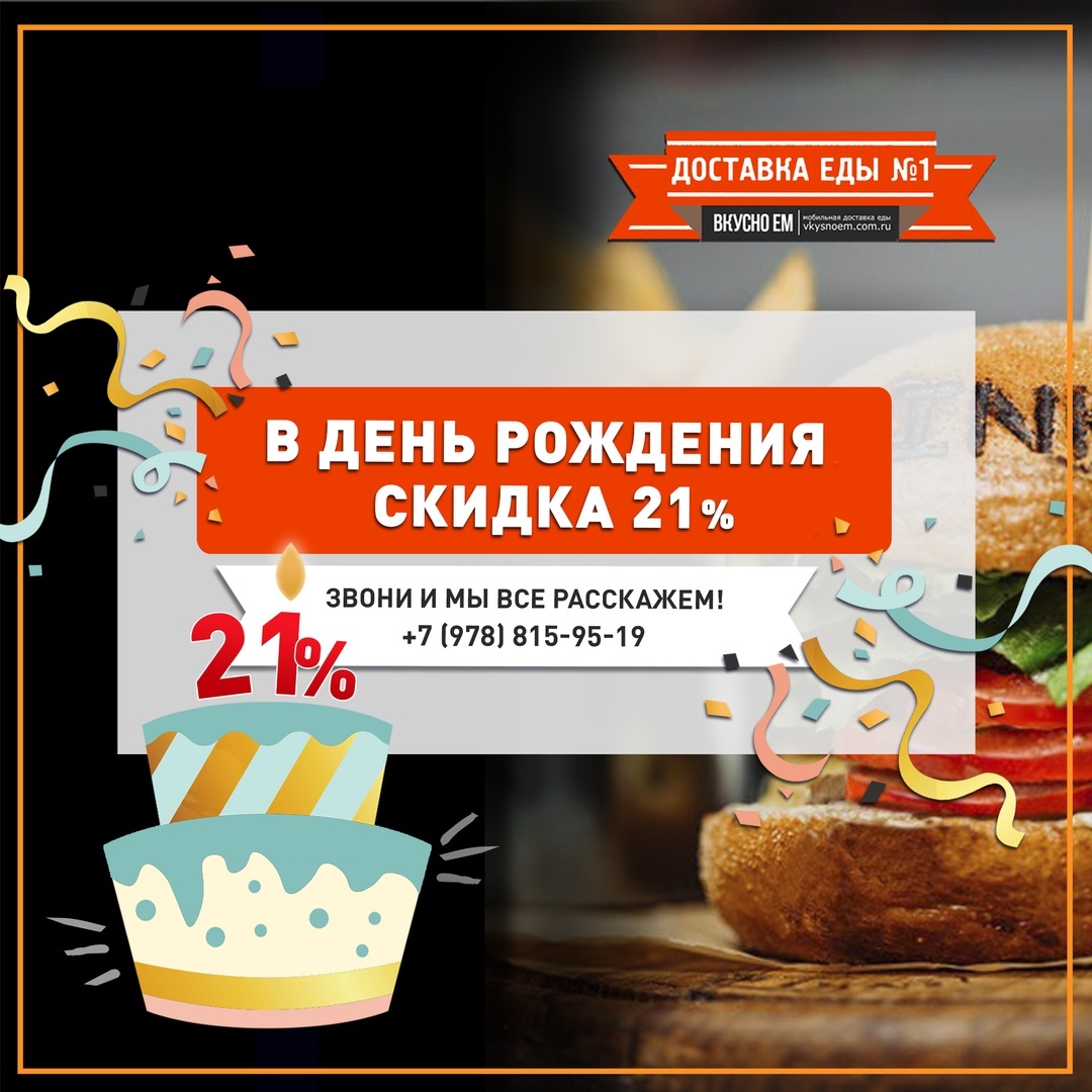Дарим скидку 21 % на твой заказ! Скидка распространяется на всё меню Доставки еды «Вкусно Ем» и действует для участников бонусного клуба ВкусноЕм, которым ты можешь стать без проблем.