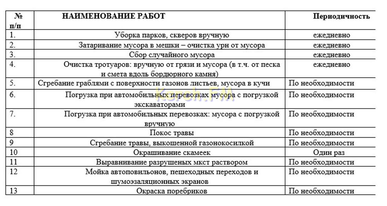 «Контрактом предусмотрено выполнение следующих видов работ: содержание парков и скверов на территории муниципального образования городской округ Керчь РК, в том числе, Комсомольского, Молодежного, сквера у морвокзала, сквера по улице Пирогова и т.д., обслуживание и ремонт малых архитектурных форм и скамеек в общественных местах, покос травы на территории объектов, и ее вывоз, сбор мусора и листвы с тротуарных дорожек, также подрядчик обязан следить за своевременным опустошением урн на территории парков и скверов, не накапливать в них мусор», - говорится в сообщении.