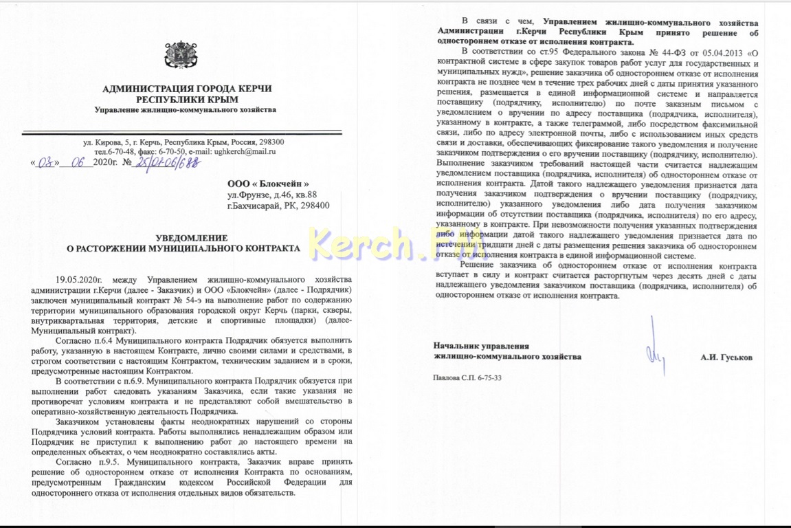 УХКХ направило уведомление о расторжении муниципального контракта с ООО «Блокчейн». Соответствующий документ есть в редакции Керчь.ФМ.