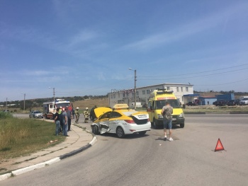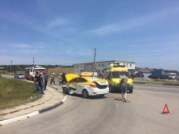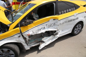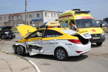 Столкнулись кроссовер «Тойота» и автомобиль такси «Хендай». На месте работает полиция, МЧС и скорая. Предварительно, пострадал водитель такси, он находится в машине скорой помощи.