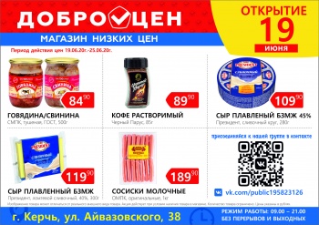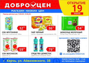 19 июня в Керчи открывается новый магазин федеральной сети «Доброцен». Популярный формат магазина низких цен, завоевавший доверие миллионов покупателей по всей России, снова приходит на помощь семейному бюджету горожан.