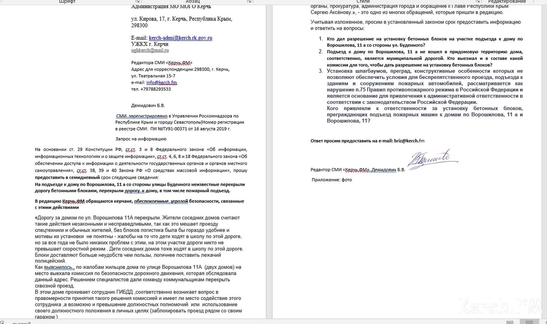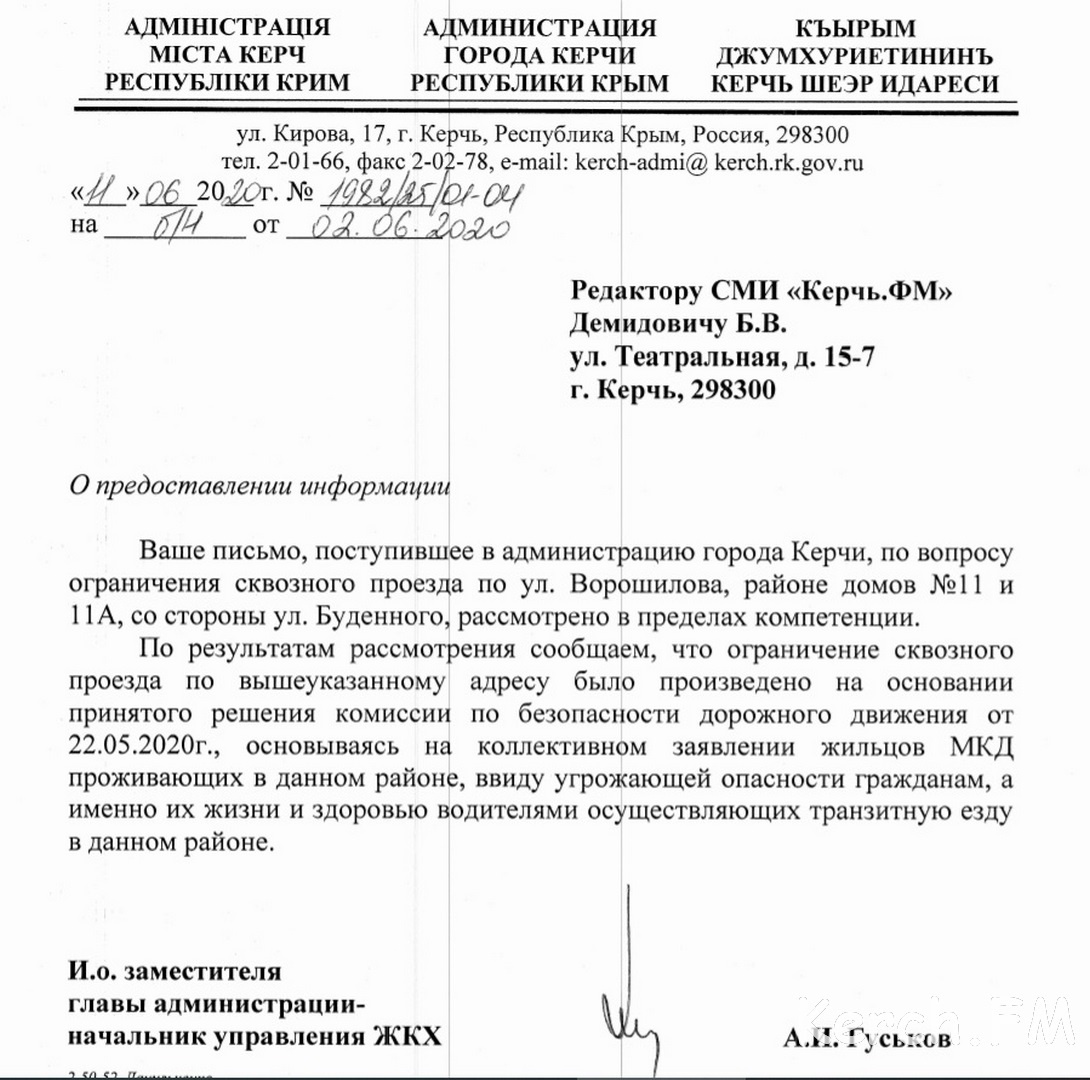 Рассматривать информзапрос (не письмо, разницу г-н Гуськов видимо, не понимает) по установке бетонных блоков, ограничивающих проезд пожарных машин, оказалось, не в компетенции исполняющего обязанности заместителя главы администрации-начальника управления УЖКХ Керчи.