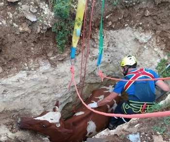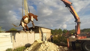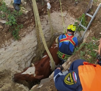 Чтобы извлечь корову, спасатели использовали шанцевый инструмент, альпинистское снаряжение и стропы, а также автокран (предоставленный хозяйкой коровы). Животное не пострадало.