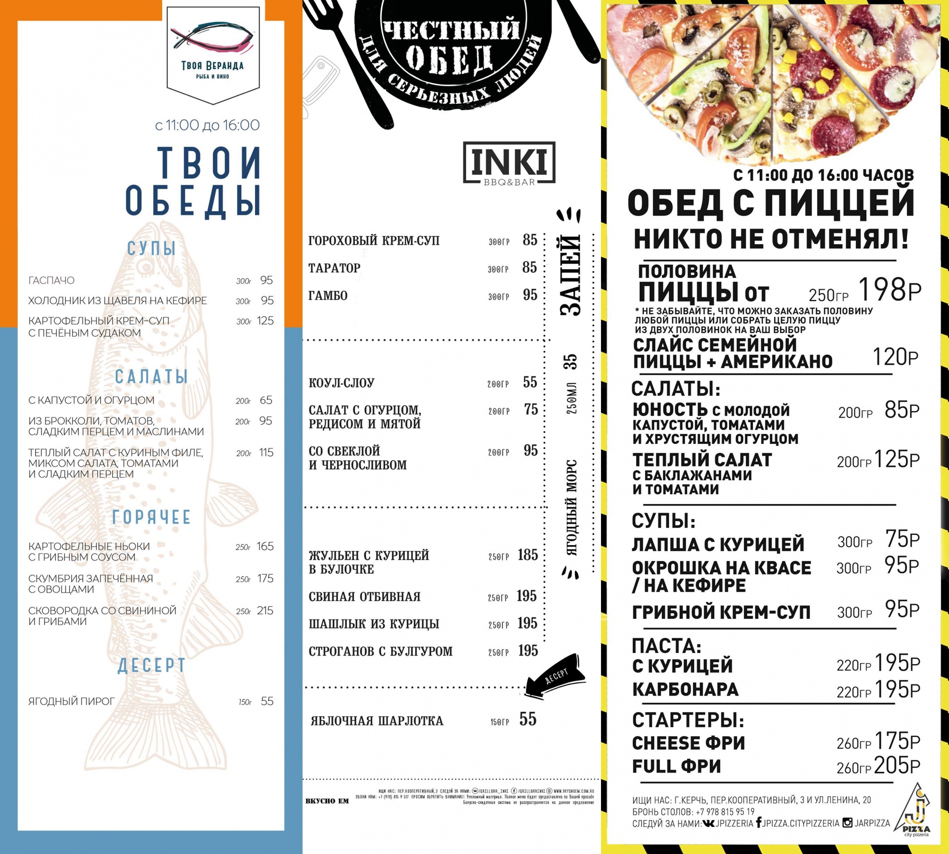 Да, это ОБЕД! И найдется на любой вкус - горячие и холодные супы, витаминные и летние салаты, сытные и еще сытнее главные блюда - INKI.BBQ&BAR, Твоя Веранда. Рыба и вино и городские пиццерии J-PIZZA готовят вкусные обеды по самым честным ценам!