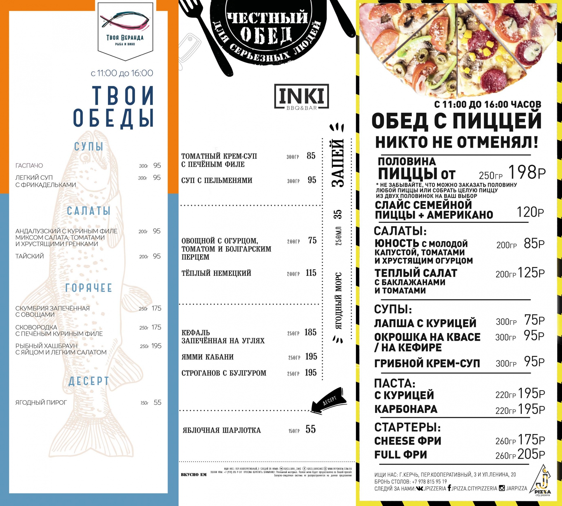 Супы, салаты, горячее, любимая пицца и паста - каждую неделю с понедельника по пятницу с 11:00 до 16:00 готовим сытные обеды по честным ценам! Сделайте перерыв, заходите на обед или Доставка еды ВкусноЕм привезёт всё прямо к вам.