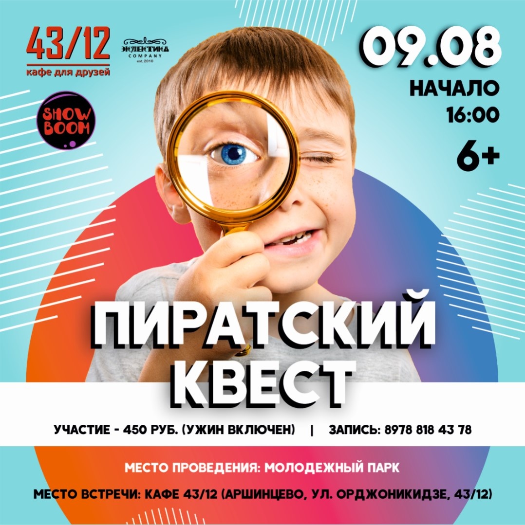 Мальчишки и девчонки, любите активно и весело проводить время? Тогда не пропустите в это воскресенье (09.08) увлекательный пиратский квест от агентства SHOW BOOM! Пройдем вместе все испытания, отыщем заветный сундук с сокровищами и отправимся ужинать в кафе 43/12. Вперед навстречу приключениям!
