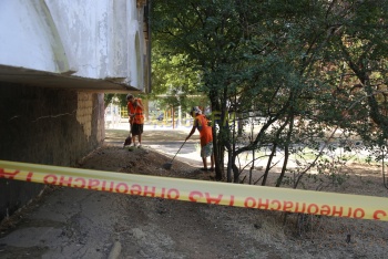 Сейчас в оцепленном дворе работают дворники.
