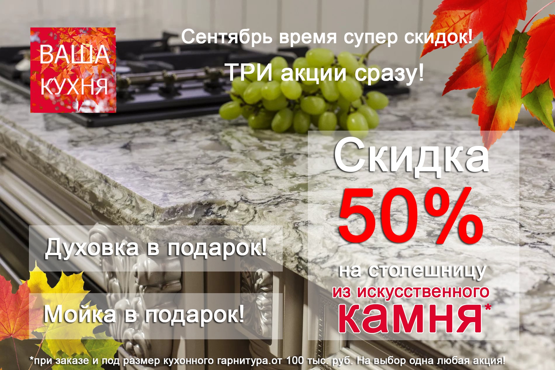 При заказе кухонного гарнитура от 100к, Вы можете выбрать под его размер и цвет любую столешницу их искусственного (акрилового) камня за полцены (-50%),