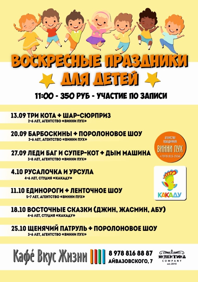 Кафе «Вкус Жизни» возобновило проведение воскресных праздников для юных гостей! Запись открыта на все мероприятия (8978 816 88 87 / 8978 835 94 44). Дети без записи принимают участие в порядке живой очереди при наличии свободных мест.