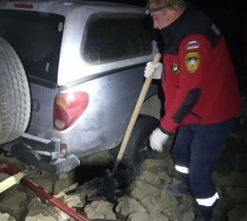 Прибывшие на место происшествия спасатели Феодосийского отряда "КРЫМ-СПАС" обнаружили машину неподалеку от арки "Звездопад воспоминаний", у подножия холма. С помощью лебедки и такелажного снаряжения машину удалось вытащить на ровную твердую поверхность.
