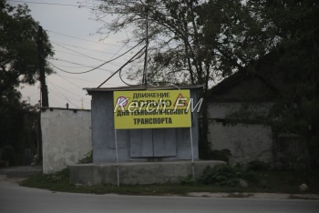 Табло со знаком проезд запрещен установлен около магазина на перекрестке с ул. Рыбакова. Многие здесь оставляют транспортные средства, а многие подъезжают к смотровой площадке и паркуются на дороге или газоне.