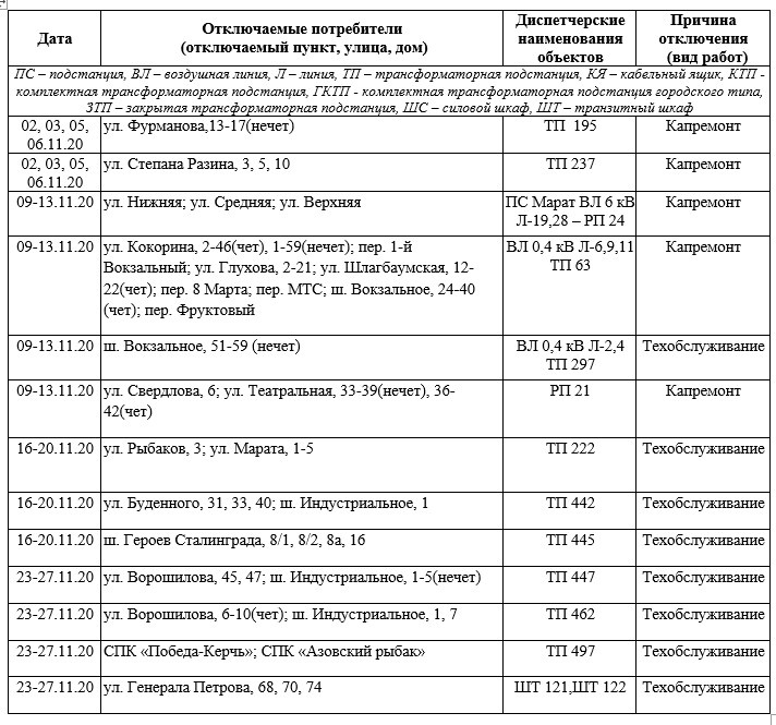 В связи с плановым ремонтом электрооборудования в ноябре в период с 8 до 17 часов будут происходить отключения линий электропередачи согласно нижеприведенному графику. Об этом сообщает ГУП РК «Крымэнерго», - передает Керчь.ФМ.