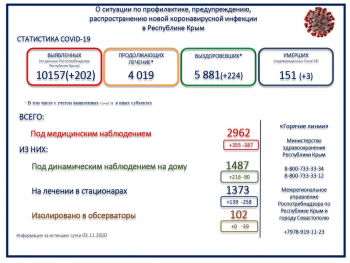 За 3 ноября на территории Республики Крым зарегистрировано 202 случая коронавирусной инфекции, в том числе 42 случая с бессимптомным течением заболевания. Общекрымскую статистику опубликовал на своей странице в ФБ Глава Крыма Сергей Аксенов.